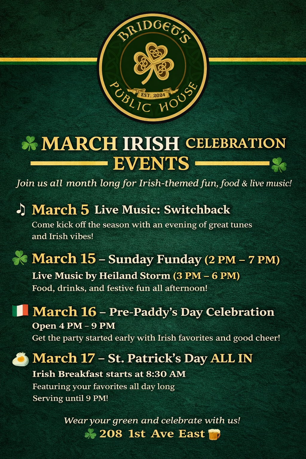 This week we will be closed on Wednesday the 11th of March to prepare for 6 days of Loving IRISH March 12-17th Corned Beef and Cabbage available until March 21